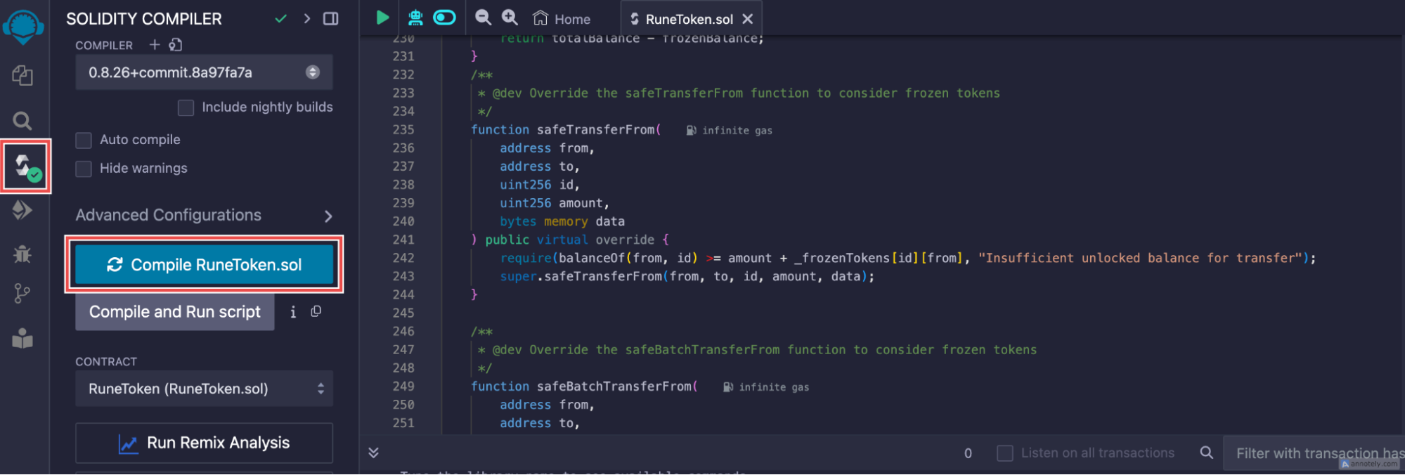 3. Click on the Compile RuneToken.sol button. A green check icon inside a circle will appear, indicating that the compilation was successful.